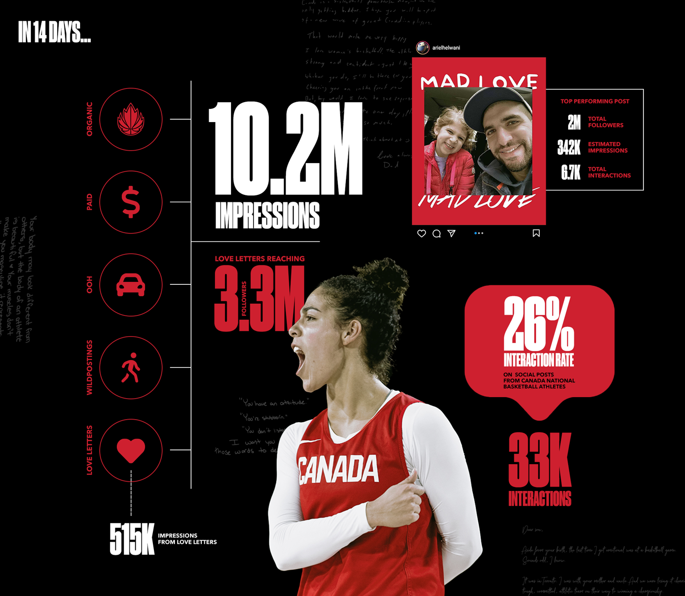 In just 14 days the campaign generated 10.2 million impressions, with a 26% interaction rate on athlete posts and love letters alone reaching 3.3 million followers. For a campaign built around handwritten letters and human vulnerability, the reach was anything but small.
