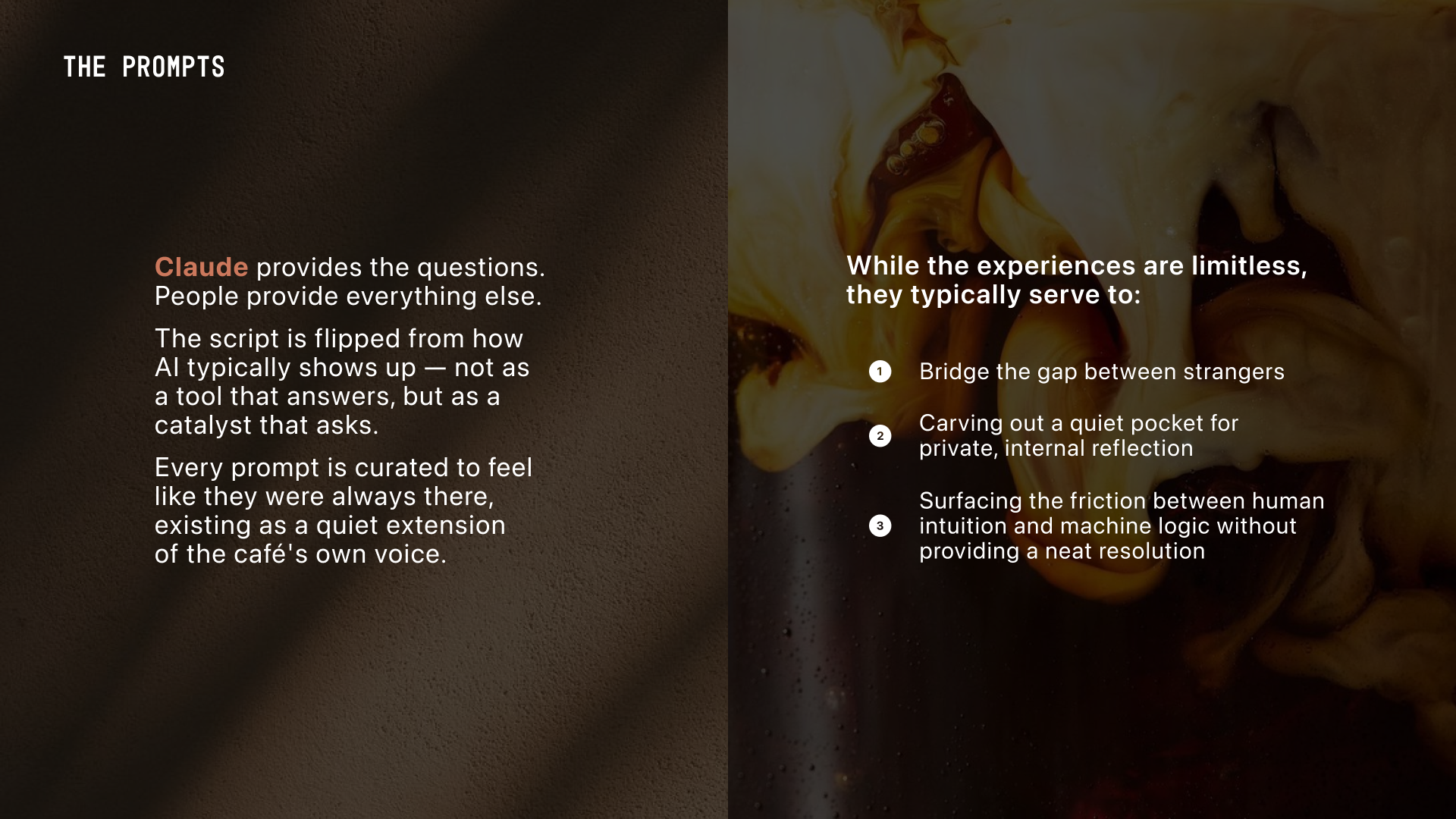 Handwritten prompts are placed across the space that invite conversation, self-reflection, or nothing at all. True to Anthropic’s core principles, the interaction prioritizes individual autonomy over forced engagement.