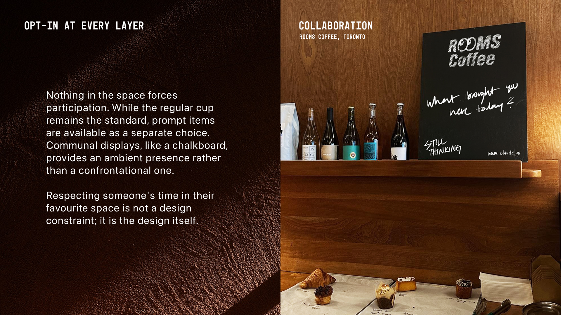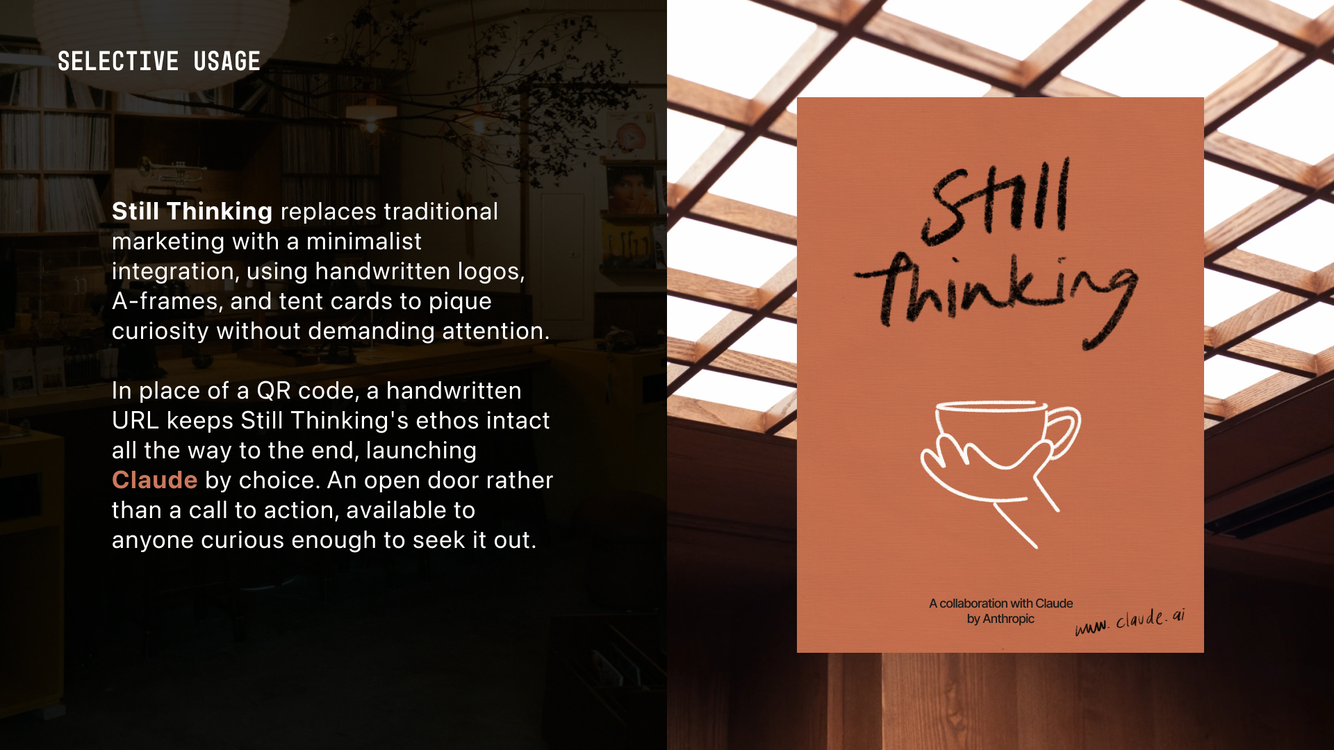 Still Thinking is a quiet, human-first residency in cafes beloved by the communities they reside in. Rather than showcasing what AI can do, Anthropic is reframing the “brand pop-up” with restraint and trust. By deferring to each café’s unique character, Still Thinking exists as a quiet guest rather than a loud takeover—seamlessly integrating into the space to honour the community’s established rhythm.